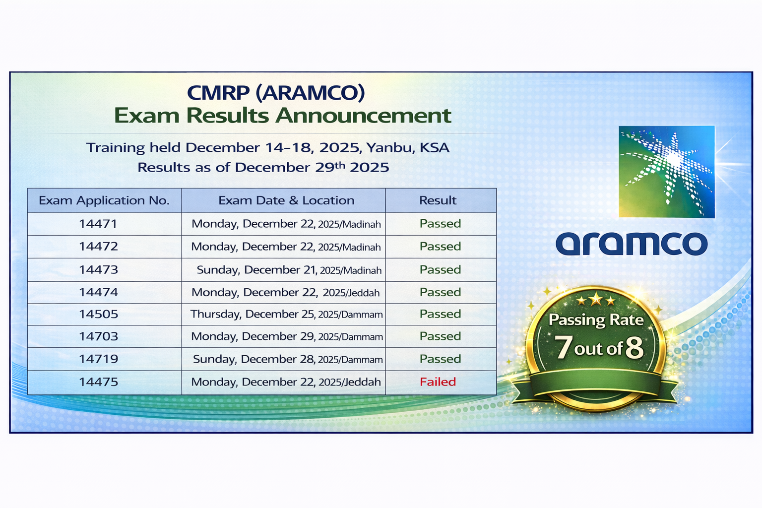 I am pleased to inform you that i have been successfully obtained API510 certification. I would like to express my thanks to your team of organizer, coordinates Mrs. Nasimah and specially our instructor Mr. Mohamed Kader for the support they provided us during our course from knowledge sharing including mock up exams and participation practically and effectively in group discussion sessions to end up well prepared in a level to pass this exam in addition of the well facilities and organization set up made..